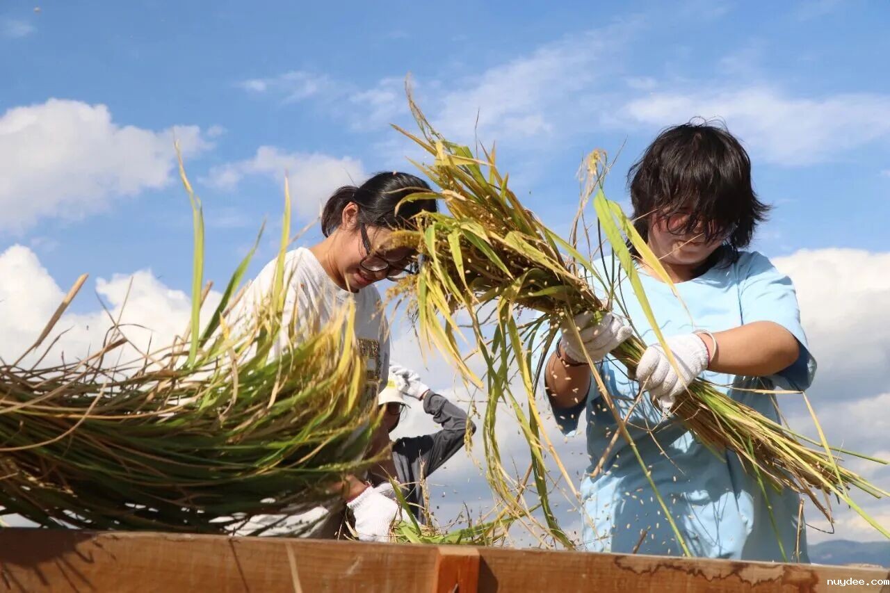 活动现场,在老师的悉心指导下,同学们挽起衣袖、拿起镰刀,从分辨稻穗成熟度、掌握收割力度,到捆扎稻秆、打谷脱粒,一步步体验水稻收割的完整流程。烈日下,汗水浸湿衣服,却挡不住大家的劳动热情。